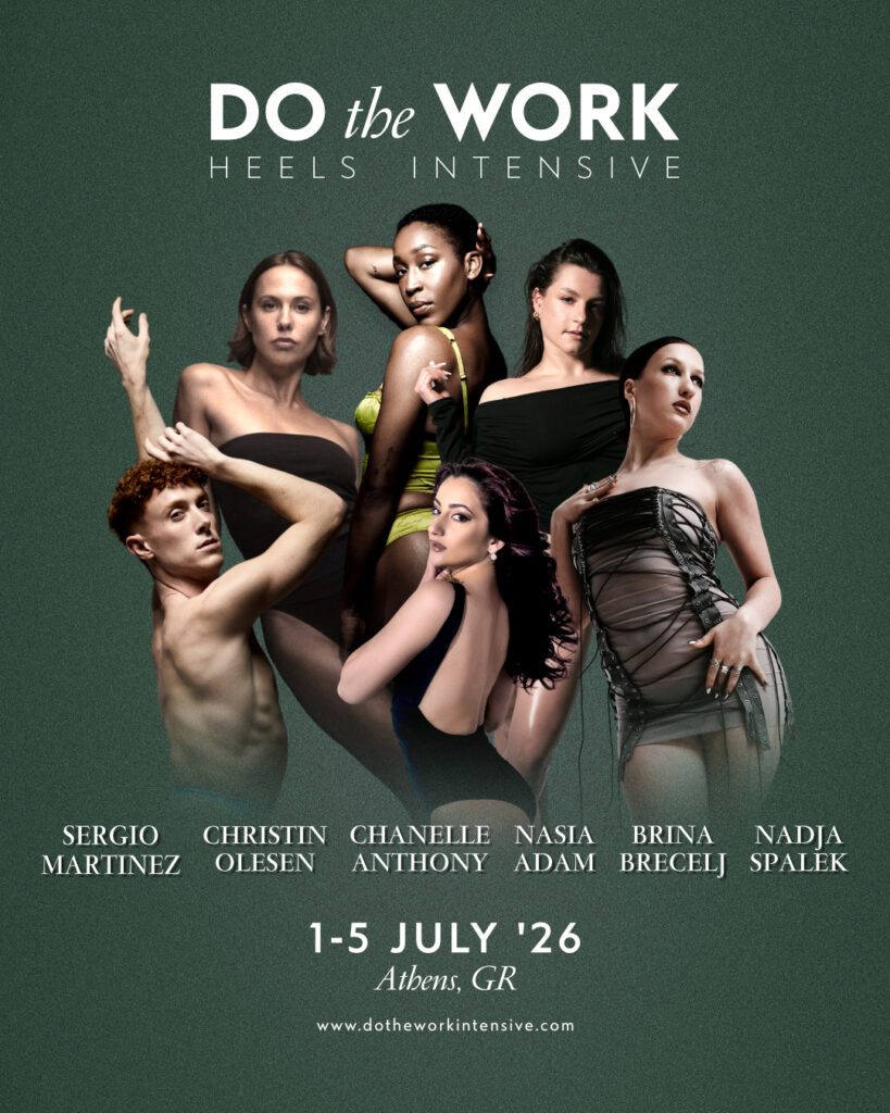 Nasia has also built a successful career as a dance teacher in the heels community in Greece ,where she created her own training system Dotheworkheelstraining. She is the founder of the annual Dotheworkheelsintensive ,a 5-day workshop that she organizes every year with her partner Christina Tsoukari.